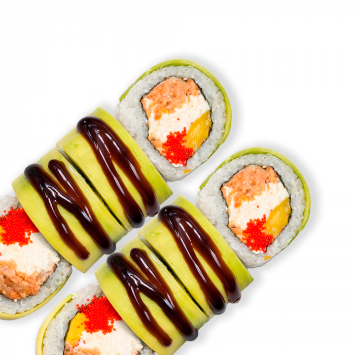 Склад : норі, рис, крем-сир, запечений лосось, манго, ікра тобіко, авокадо, соус унагі