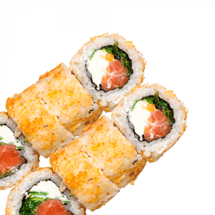 Склад: рис, крем-сир, лосось, салат чука, стружка тунця.
