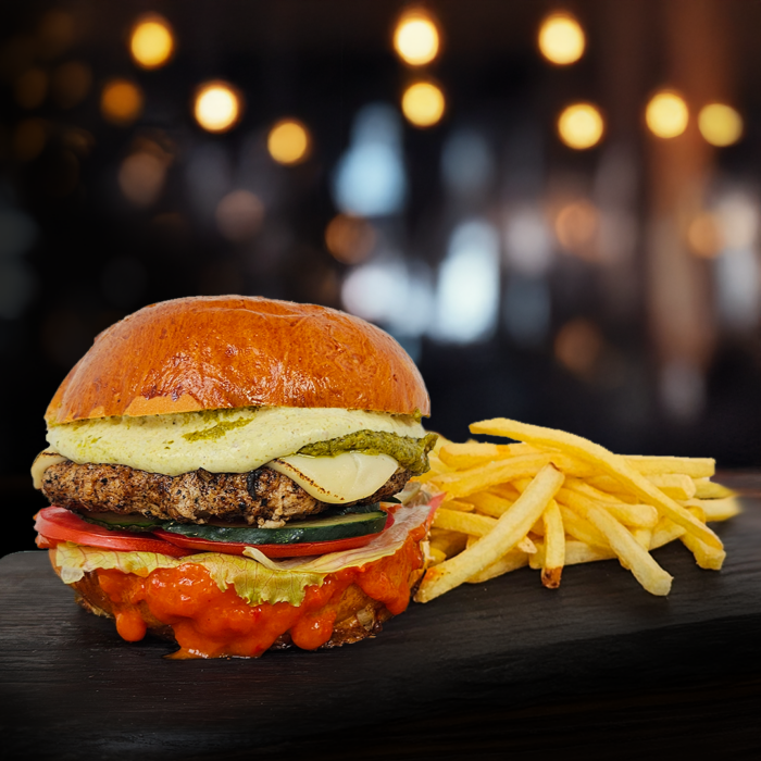 Булочка бріош , куряча котлета , соус барбекю , соус песто , айсберг , огірок свіжий , томати , сир моцарела , картопля фрі