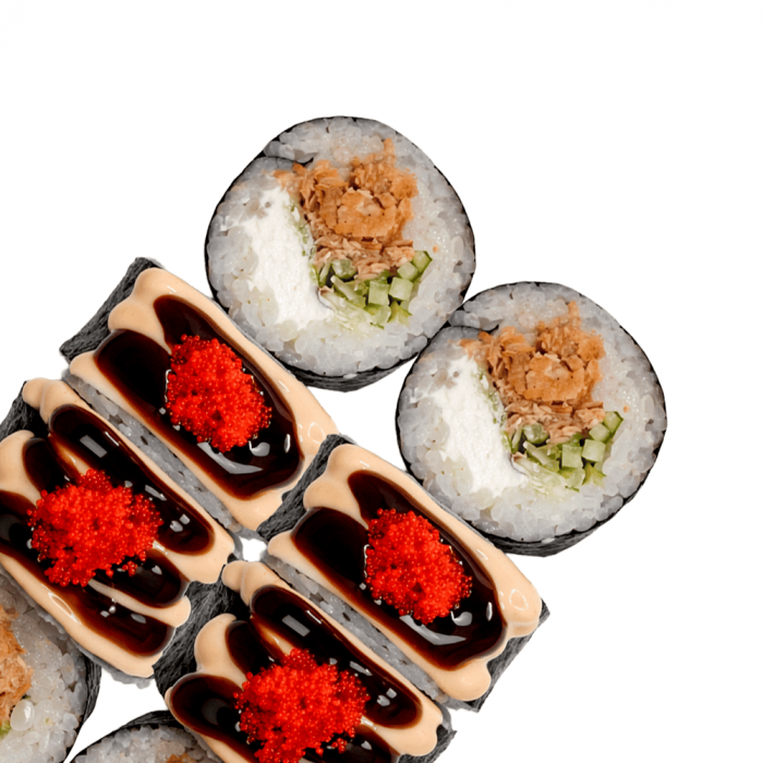 Склад: рис, крем-сир, смажений лосось, огірок, айсберг, унагі, спайсі, червона ікра тобіко.