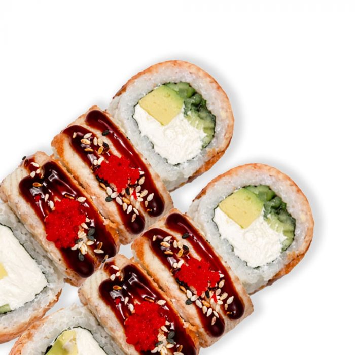 Склад : норі, рис, крем-сир, авокадо, огірок, ікра, вугор, соус унагі, кунжут мікс