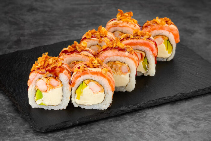 рис, норі, грильований слабосолений лосось, креветка в темпурі, сир філадельфія, авокадо, соус унагі, соус бао , цибуля кріспі