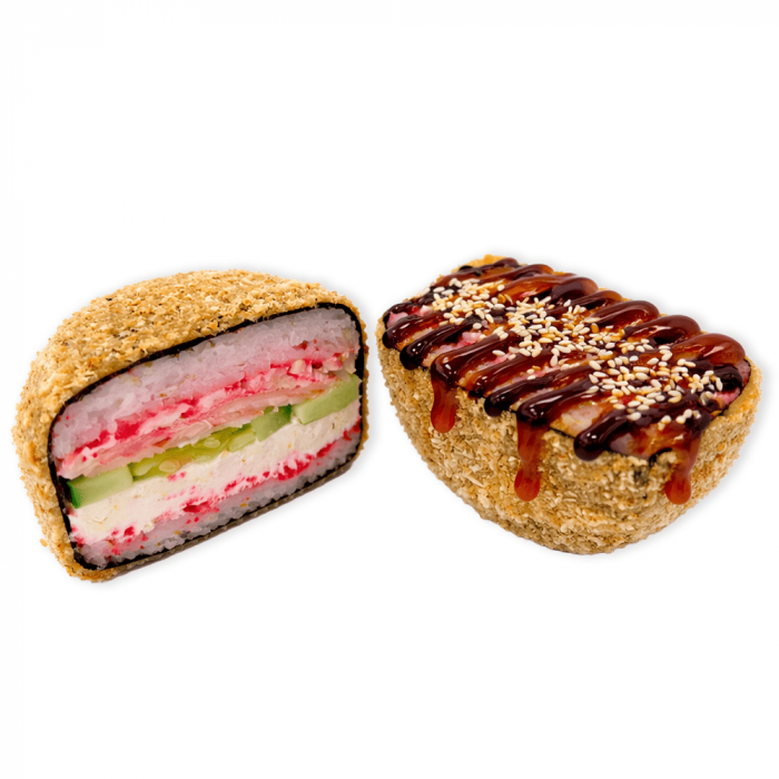 Склад: рис, крем-сир, огірок, червона ікра тобіко, креветка, краб, майонез, темпура, панко, соус унагі, соус манго-чилі, кунжут чорно-білий.