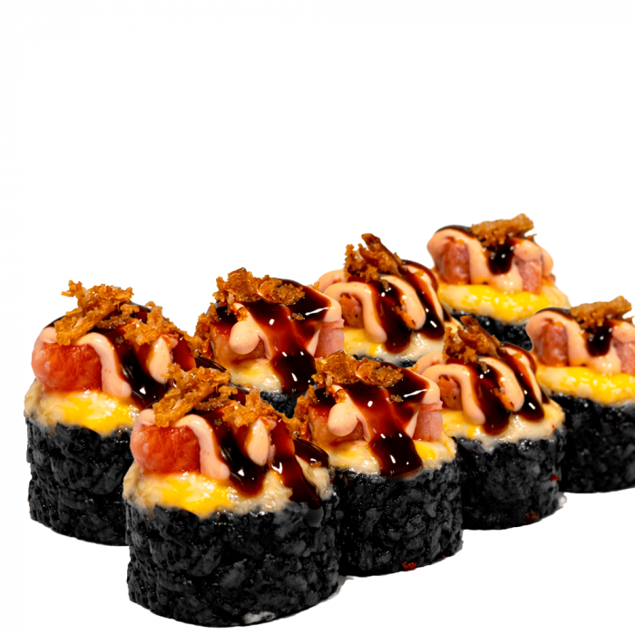 Склад: чорний рис, крем-сир, авокадо, лосось, пармезан, чеддер, майонез, унагі, соус спайсі, цибуля смажена